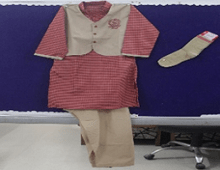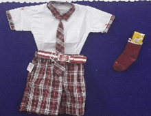 White Shirt, Mehrun Check Short ,Tie, Maroon Belt and Socks.