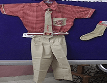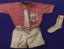 Red Check Shirt, Fawn Short, Tie, Belt and Fawn Socks.