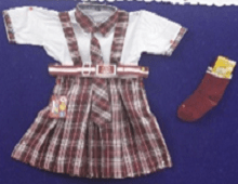 Red Check Shirt Fawn Skirt, Tie, Belt and Fawn socks.